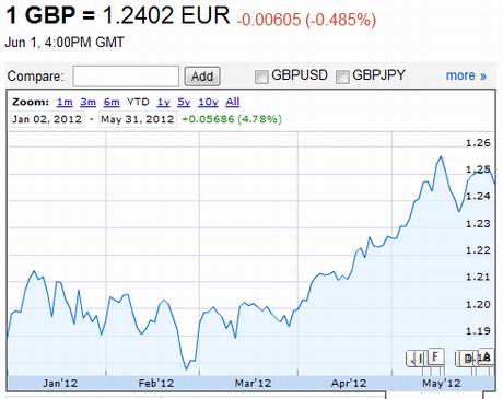 The peaks on troughs that we have experienced throughout May saw prices swing from €1.23 to €1.2550 in a day more than once as news from the Eurozone dominate the news feed.