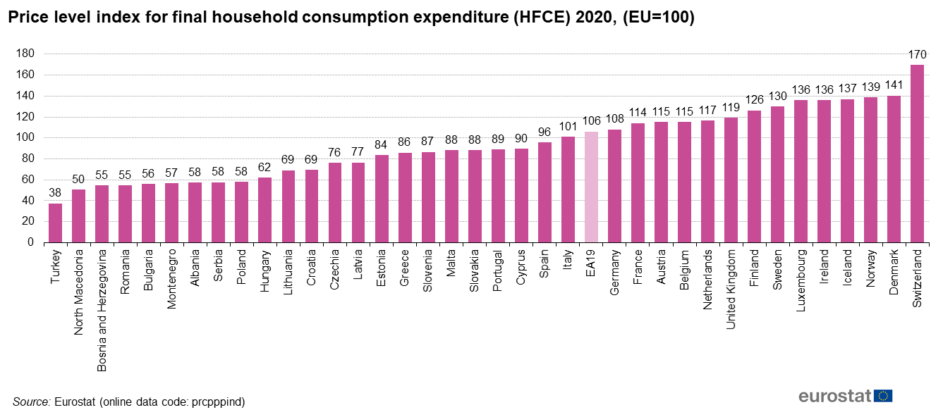 Eurostat compares price levels for consumer goods and services using purchasing power parity to adjust for currency differences to get a comparable cost of living index for each European country in the survey.