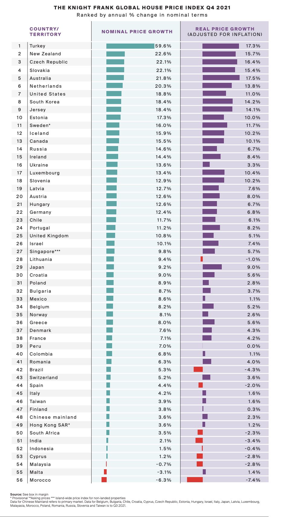 As far as global house prices go, Knight Frank expect “more muted growth in 2022 as risks mount.”