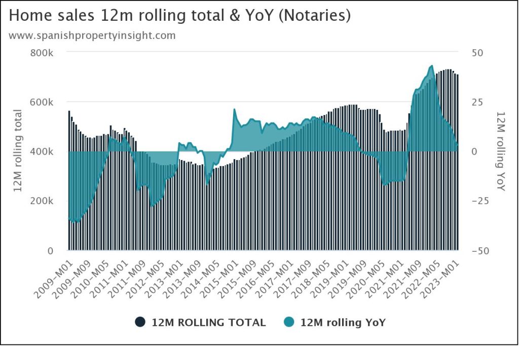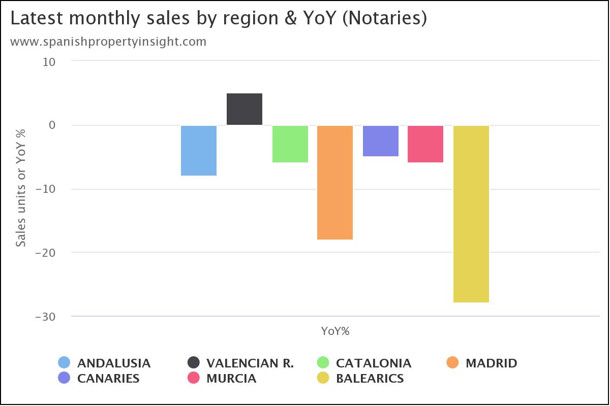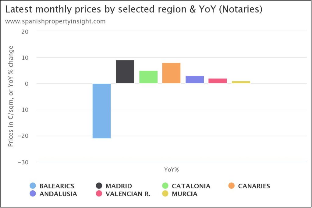 Looking at price change in selected regions, price growth was still positive in all regions bar the Balearics, where prices declines 21%, similar to sales. Price growth was still positive in all other regions led by Madrid (+9%), the Canaries (+8%), Catalonia (+5%), Andalusia (+3%), the Valencian region (+2%), and Murcia (+1%).