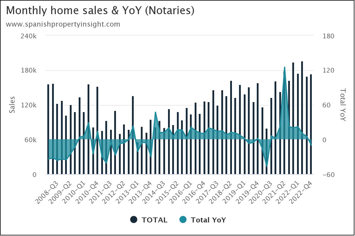 If you look at quarterly figures going back to 2008 (next chart) you clearly see the post-pandemic boom that lifted sales to levels not seen since the boom in the noughties, and which we are now seeing running out of steam.