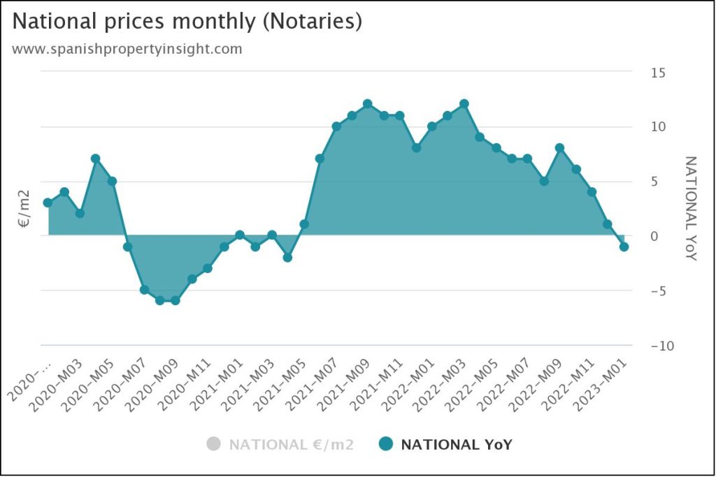 National average prices fell by 1.45% in January according to the notaries, the first decline since April 2021, at the end of a period when prices were driven down by the pandemic. The next chart illustrates the price change going back to the start of 2020, just before the pandemic, and the recent trend is clear: the post-pandemic price boom is over.