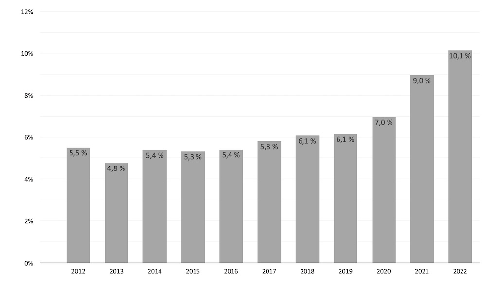 As you can see from the chart above, the number of foreign investors spending half a million euro and up has risen significantly in the last three years. Having hovered around 5% to 6% between 2012 and 2019 it started climbing rapidly between 2020 and 2022. So the market share of wealthier buyers is growing fast.