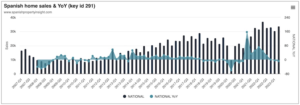 Foreign demand performed better than local Spanish demand, which declined 16pc in Q2 and 11pc in Q1, so foreign buyers are gaining market share from Spanish buyers despite an absolute decline in numbers. Foreign buyers were 18.8% of the market in 2022, according to MITMA data.