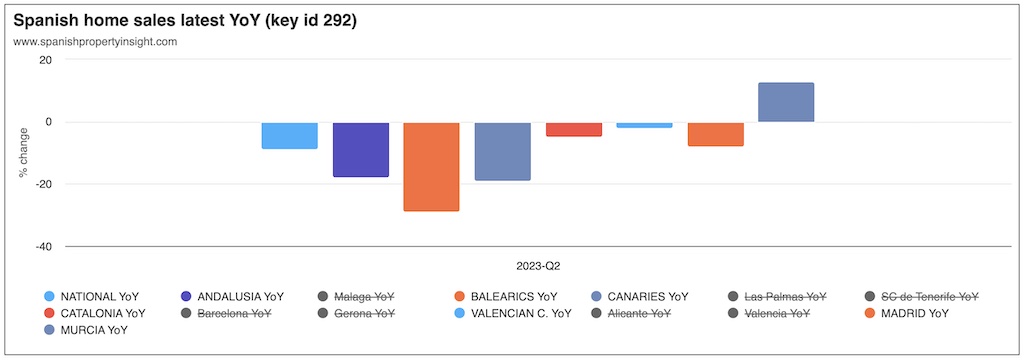 By residency segment, foreign non-residents (FNR) were down 13pc in Q2, and expat buyers down 5pc, so the fall in foreign demand was more pronounced amongst foreigners buying holiday-homes and investments in Spain.