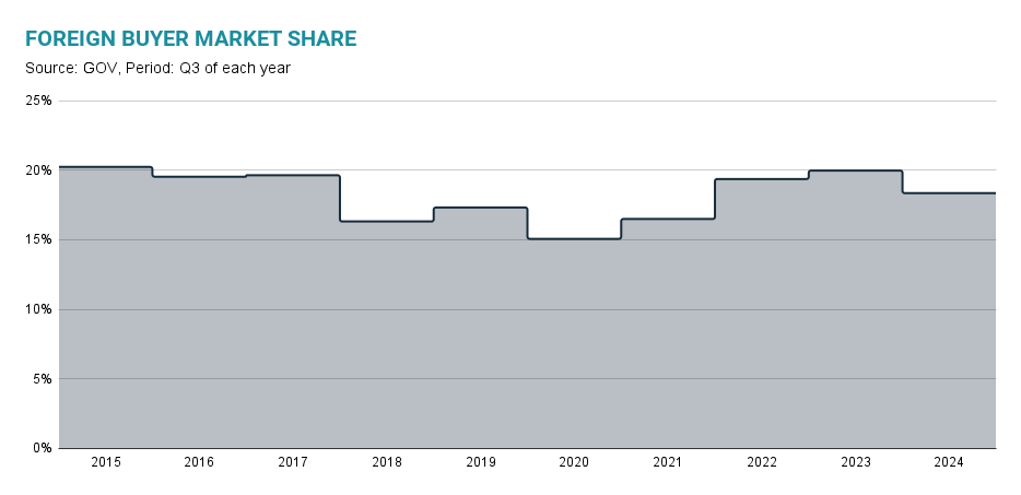 This year has been defined by the strong performance of local buyers. While foreign demand has remained steady, its relative share has declined in the face of even stronger domestic appetite. In the third quarter, 30,408 transactions involved a foreign buyer—up 7% year on year. Of these, 16,916 purchases were made by expatriates (an 8% increase) and 13,492 by foreign non-residents buying second homes (a 6% rise).