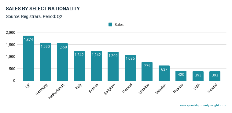 As usual, the British were the largest group of foreign buyers in Q2, chalking up 1,874 purchases. They were followed by the Germans with 1,590, and the Dutch with 1,558.