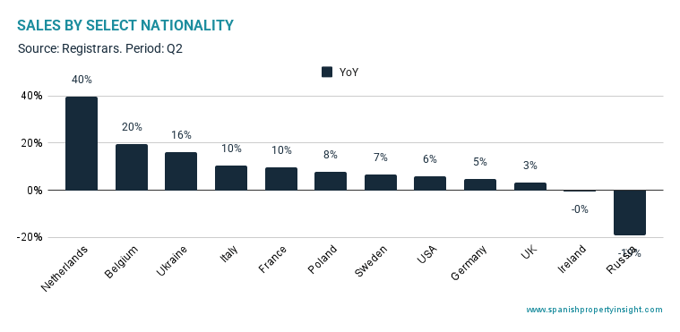 But the growth story belongs to the Netherlands. Dutch demand surged by 40% compared to Q2 last year, making them the fastest-growing major market. The Belgians also saw healthy growth, up 20%. Almost all the main foreign-buyer nationalities increased their activity—except for Russia, where purchases fell 19%.