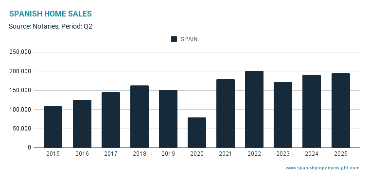 The notaries report 195,000 home sales in Q2 2025 – just 2% more than the same quarter last year. Activity is still running above the ten-year average but below the post-pandemic peak of 2022. Regionally, Catalonia stood out with 31,000 transactions, its highest Q2 in over a decade, while the Balearics and Canaries both saw declines, suggesting softer demand in the island holiday-home markets.