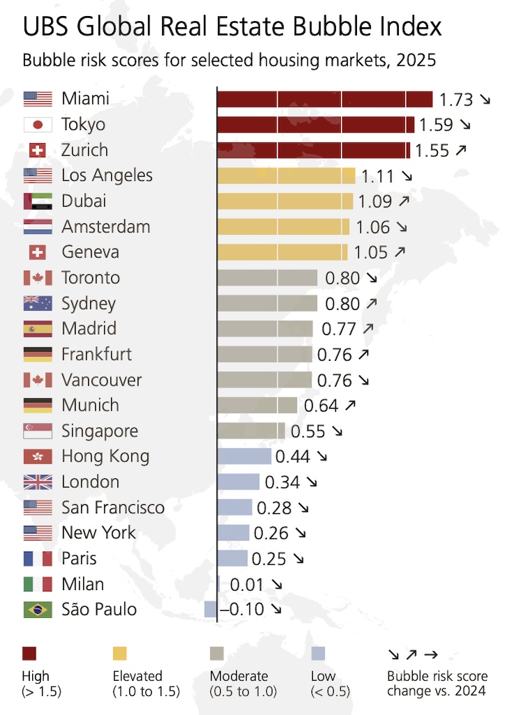 Madrid’s bubble risk score rose from 0.56 in 2024 to 0.77 in 2025 – an increase, but still within the “moderate” range. By comparison, Miami (1.73), Tokyo (1.59), and Zurich (1.55) are firmly in high-risk territory.