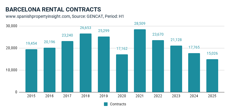 While declared rents in official contracts did edge down slightly, asking prices on the open market soared—up over 12% year-on-year in H1 2025. Meanwhile, the number of new rental contracts in Barcelona have continued to tank. Just 15,026 were signed in the first half of 2025, down 15% from last year and over 7,000 below the ten-year average (20% down). The chart above illustrates this precipitous decline.