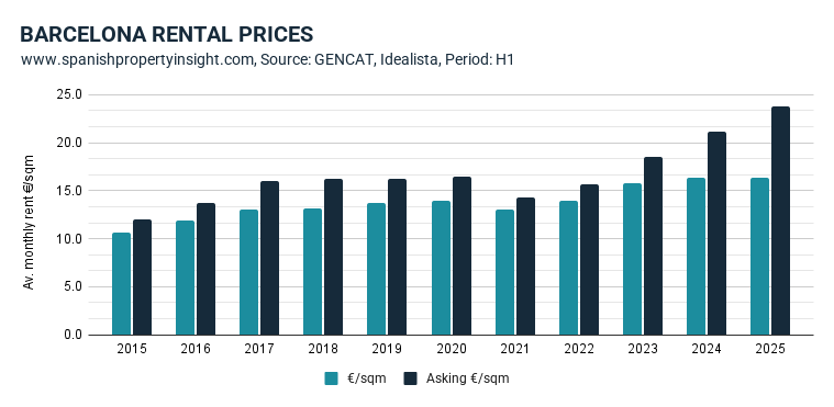 Sílvia Paneque, the Generalitat’s Councillor for Territory, Housing and Ecological Transition, was quick to trumpet the results in the Catalan Parliament this week, citing what she called a “continued trend in price containment.” According to Paneque, there has been a “cumulative 4.9% reduction in Barcelona city and 1.9% across all officially designated stressed market areas since the policy began.” The chart above illustrates the decline in average Barcelona rental prices in H1 (-4.4%).
