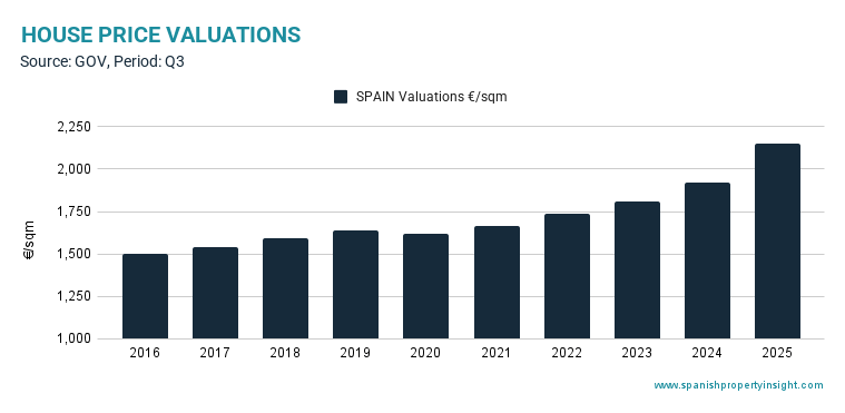 Spain’s average valuation price in Q3 came in at €2,153/m², up 12% year-on-year. That’s a remarkably strong showing given the economic and political noise of the past year, and it puts official valuations well ahead of inflation.