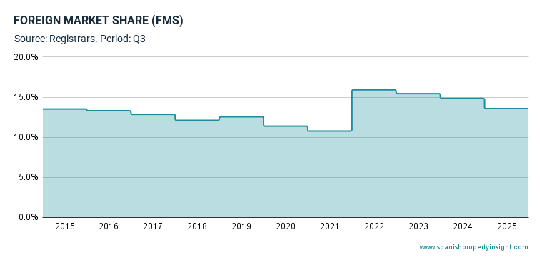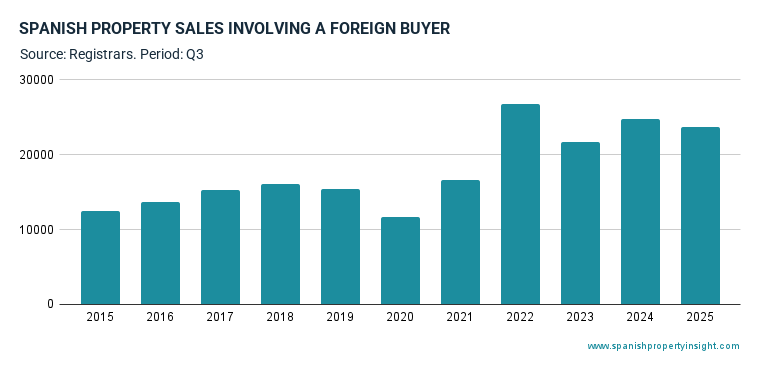 New data from Spain’s Land Registrars show that foreign demand for Spanish homes eased slightly in Q3 2025, though it remains well above historical norms.