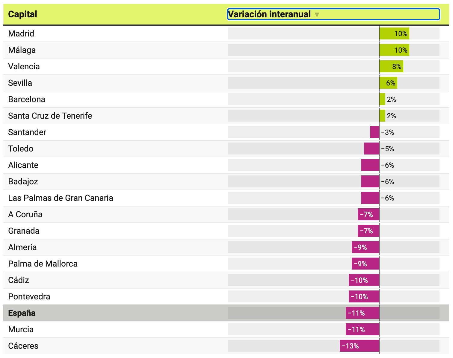 The decline was widespread, with most provincial capitals seeing fewer properties on the market than a year earlier. However, a handful of major cities bucked the trend. Supply rose in Madrid and Málaga (both +10%), followed by Valencia (+8%), Seville (+6%), and Barcelona and Santa Cruz de Tenerife (both +2%).