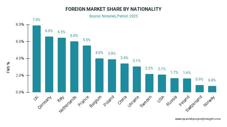 However, foreign demand lost some ground within the overall market. Spanish buyers increased their activity by 6.7% to 596,538 purchases, meaning the foreign market share slipped to 18.8%, down from 19.9% a year earlier. The foreign share remains well within the range seen over the last decade but clearly eased in 2025.
