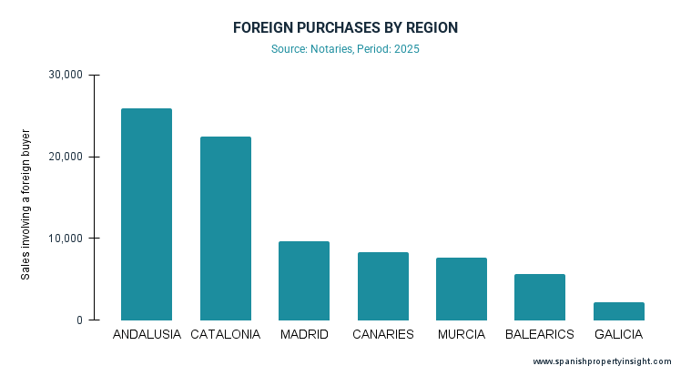 By region, the Valencian Community remained the undisputed centre of foreign demand with 39,338 purchases—almost 29% of the entire foreign market—despite a 5% year-on-year decline.