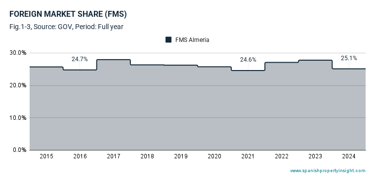 The share of foreign buyers in the Costa de Almería market fell to 25% in 2024 from 28% in the previous year (Fig. 1-3), indicating a relative slowdown in international interest, potentially due to higher financing costs and global uncertainties.