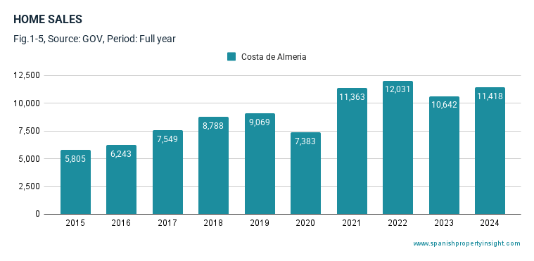 Focusing specifically on key Costa de Almería municipalities, 11,418 homes were sold (Fig. 1-5), showing an annual increase of 7% and a decade-long rise of 97%, highlighting the region’s growing popularity.