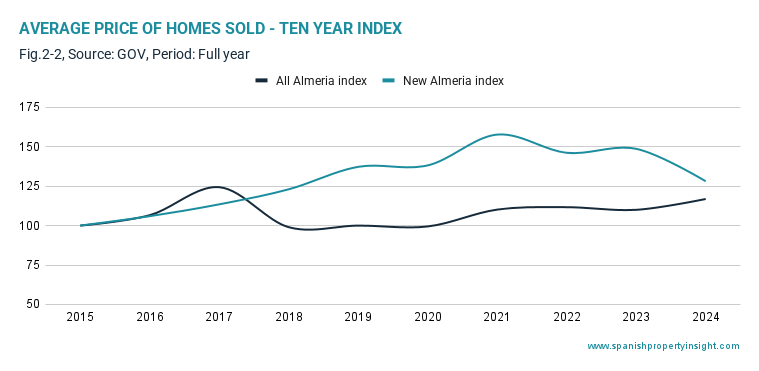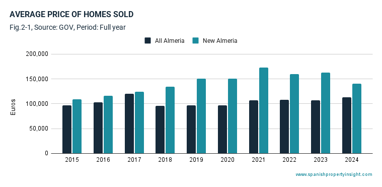 The average property price in Almería during 2024 stood at €113,304 (Fig. 2-1), reflecting a 6% year-on-year increase. In contrast, new-build homes averaged €140,063, representing a 14% decline compared to the previous year, pointing to possible market corrections, builder incentives, or product mix shifts.
