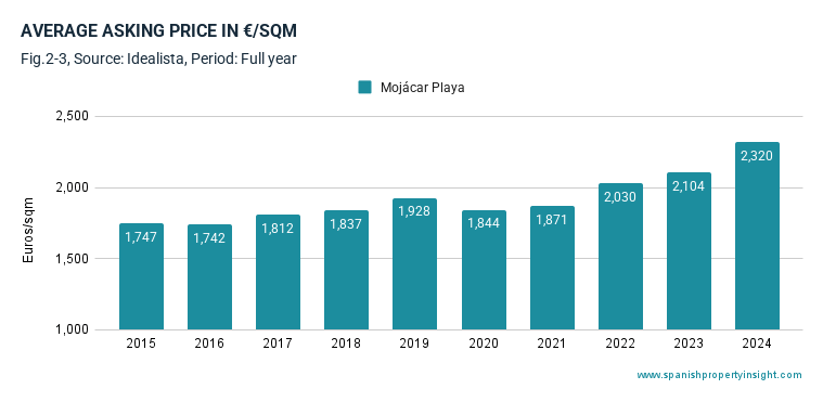 In Mojácar Playa, a popular coastal destination within the area, average asking prices reached €2,319.75 per square metre, up 10% over the previous year (Fig. 2-3). Over five years, asking prices here climbed 20%, reflecting strong buyer interest and limited supply.