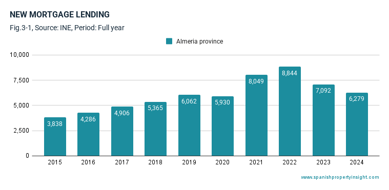 In 2024, there were 6,279 new mortgages signed in the province of Almería (Fig. 3-1), 11% fewer than the previous year. Despite the short-term decline, this total is 4% above the ten-year average and 64% higher than a decade ago, showing a long-term rise in mortgage activity.
