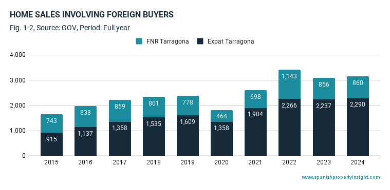 Sales involving foreign buyers reached 3,150—an increase of 2% from the previous year. This segment grew by 28% compared to the ten-year average and is up 90% over a ten-year horizon. Of these sales, 2,290 were made by expatriates living in Spain, while 860 involved foreign non-residents (FNR), typically purchasing second homes or investment properties (Fig. 1-2). Purchases by expats increased 2% year-on-year and have grown 150% over the past decade. FNR sales were largely stable, up only 0.5% from the prior year and 16% over ten years.