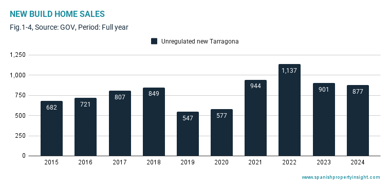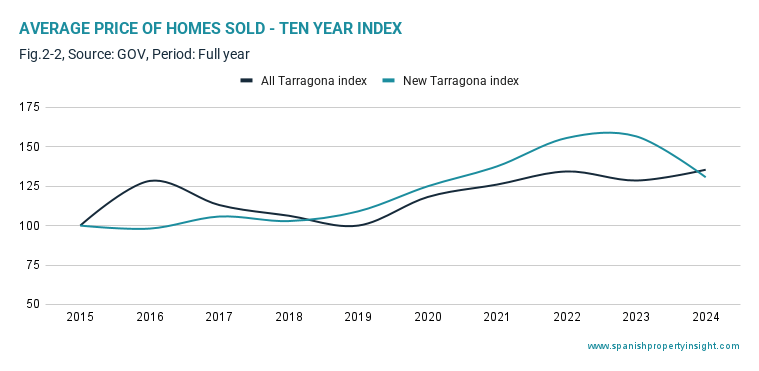 The average home price in Tarragona in 2024 was €138,341 (Fig. 2-1), a year-on-year increase of 5%. By contrast, newly built properties posted an average price of €178,055, reflecting a 17% annual decline. This divergence raises some interesting questions about supply trends or changes in buyer preferences, particularly in new development types or locations.