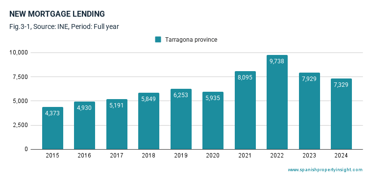 There were 7,329 new mortgages signed in Tarragona province in 2024 (Fig. 3-1), representing an 8% year-on-year decline. However, this figure remains 12% above the ten-year average and 68% higher than a decade ago, underlining the long-term recovery of the credit market.