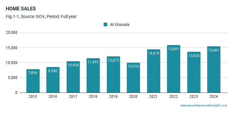 In 2024, the Costa Tropical housing market reported a total of 15,461 home sales, a marginal year-on-year increase of 13% compared to 2023 (Fig. 1-1). This figure was also 29% higher when compared with the ten-year average. Over the past decade, total sales have increased by a notable 96%, suggesting sustained long-term growth in housing demand.