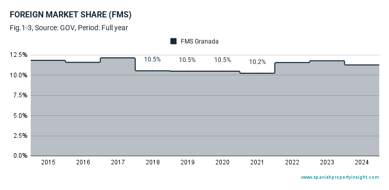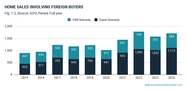 Foreign buyers accounted for 1,704 transactions, representing a year-on-year increase of 8%. This group continues to play a significant role in the regional market, although its overall presence has softened. Of these international buyers in 2024, 1,115 were foreign residents (expats) living in Spain, while 589 were foreign non-residents (FNRs) acquiring second homes or investment properties (Fig. 1-2).