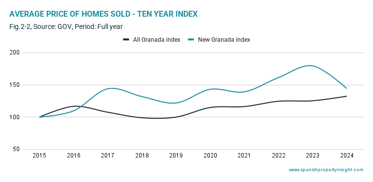 During 2024, the average sale price of residential property in the province of Granada reached €129,653 (Fig. 2-1), reflecting a 6% annual increase. In comparison, newly-built properties averaged €151,682, which represented a 20% decline year-on-year — a shift which may reflect rebalancing demand, incentives, or pressure on developers.