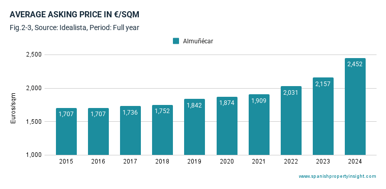 In Almuñécar, one of Costa Tropical’s key municipalities, the average asking price in 2024 stood at €2,452 per square metre, a rise of 14% year-on-year (Fig. 2-3). Over the last five years, asking prices have increased by 33%. According to the ten-year index of asking prices, the market has risen from a base of 100 to 143.7, illustrating a 44% gain in vendors’ pricing expectations over the decade.