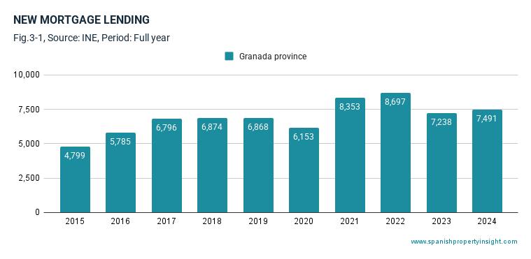A total of 7,491 new mortgages were issued in Granada province during 2024, reflecting a 3% increase year-on-year (Fig. 3-1). This figure is 8% higher than the ten-year average and represents a 56% rise in mortgage activity over the decade, indicating long-term confidence in real estate financing.