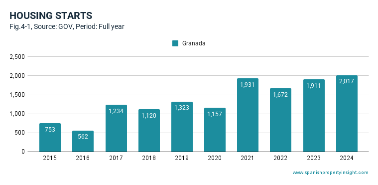 The number of new housing starts in 2024, measured by planning approvals, totalled 2,017 units across Granada province (Fig. 4-1). This was a 6% increase on the previous year and a substantial 47% over the ten-year average. Importantly, new starts have increased by 168% over the past decade, indicating strong long-term growth in residential development. This reflects both population expansion and investor confidence in the region.