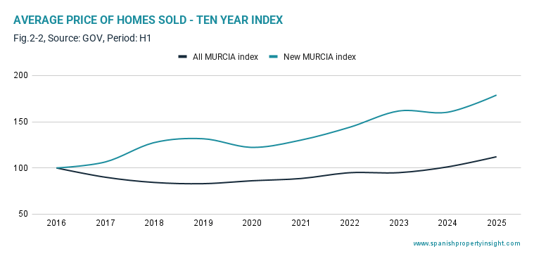 According to the Housing Ministry, the average price of homes sold in Murcia province during H1 2025 was €128,705 (Fig. 2-1), up 11% year-on-year. The average price of new-build property stood at €214,715, marking a 12% increase over the same period.