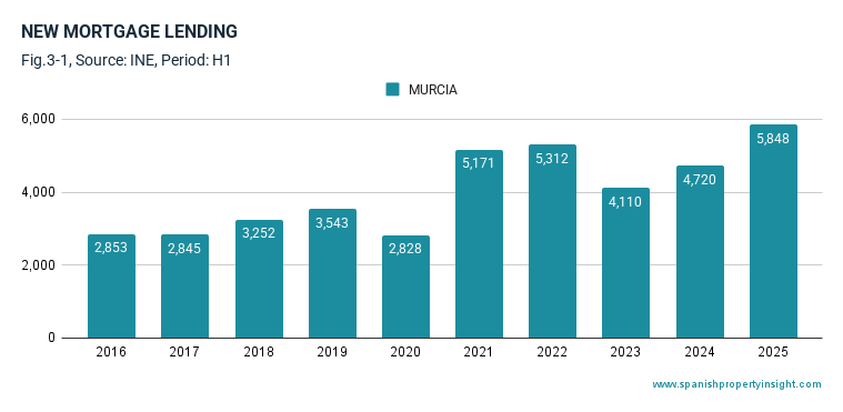 Murcia province recorded 5,848 new mortgages in the first half of 2025 (Fig. 3-1), an increase of 24% compared to the same period last year. Lending volumes were also 58% higher than the ten-year average and up 157% over the decade, demonstrating an active credit market supporting transactions.