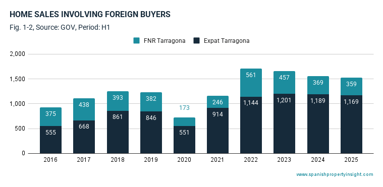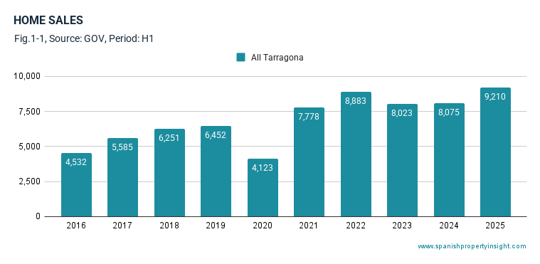 There were 9,210 home sales in Tarragona province in H1 2025, representing a year-on-year increase of 14% (Fig. 1-1). Compared to the ten-year average, sales were up 44%, and over the last decade transaction volumes have risen by 127%, confirming a structurally larger market than ten years ago.