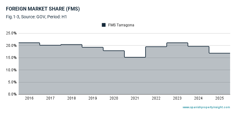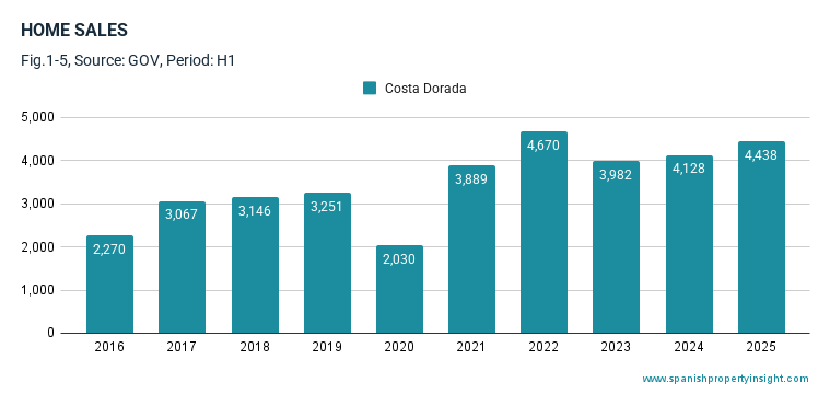 Focusing specifically on Costa Dorada municipalities, there were 4,438 home sales in the period, a year-on-year increase of 8% (Fig. 1-5). Sales were 27% above the ten-year average and 96% higher than ten years ago, underlining the long-term expansion of this coastal sub-market.