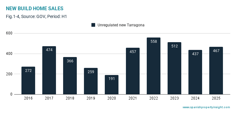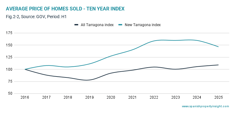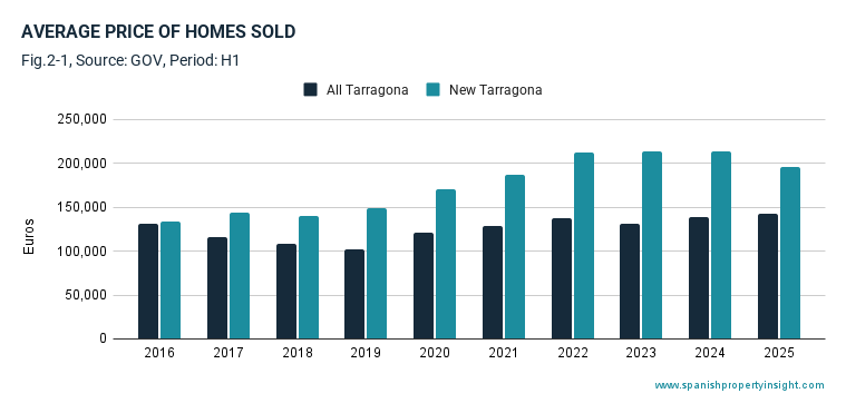 According to the Spanish Housing Ministry, the average price of homes sold in Tarragona province during H1 2025 was €142,982 (Fig. 2-1), up 3% on an annualised basis. The average price of newly built homes was €195,724, down 8% year-on-year.