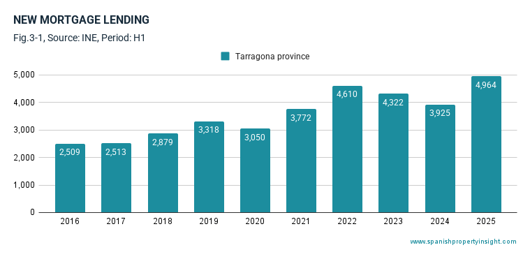 There were 4,964 new mortgages signed in Tarragona province in H1 2025 (Fig. 3-1), up 26% year-on-year. Lending activity was 50% above the ten-year average and 134% higher than a decade ago, indicating a strong recovery in mortgage-backed demand.