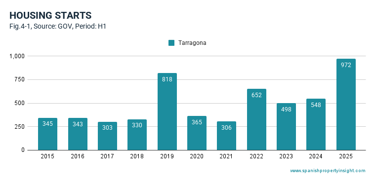 There were 972 housing starts in Tarragona province based on planning approvals during H1 2025 (Fig. 4-1), representing a sharp 77% year-on-year increase. Compared to the ten-year average, housing starts were up 116%, and over ten years they have increased by 182%. This surge points to renewed developer confidence, likely encouraged by sustained sales volumes and long-term price growth, particularly in coastal areas such as the Costa Dorada.