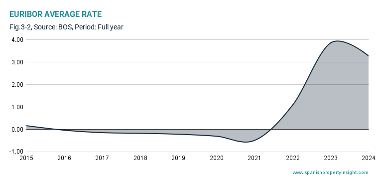 The average Euribor rate, the benchmark for most variable-rate mortgages in Spain, stood at 3.27% for the period (Fig. 3-2). This compares with a high of 3.86% in 2023 and a low of -0.49% in 2021. The figure represents a notable decline and points to a potential shift in interest rate trends across the eurozone.