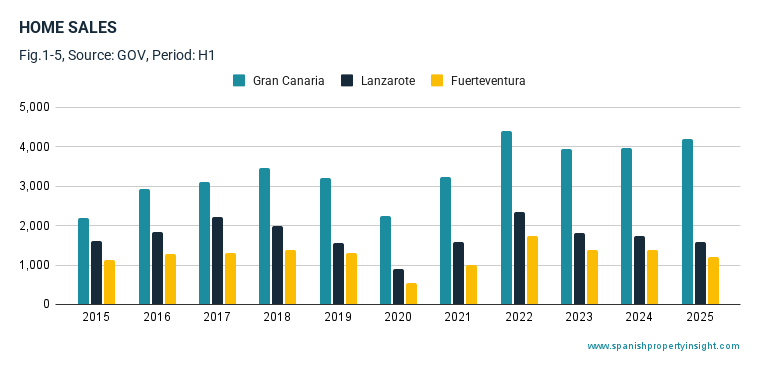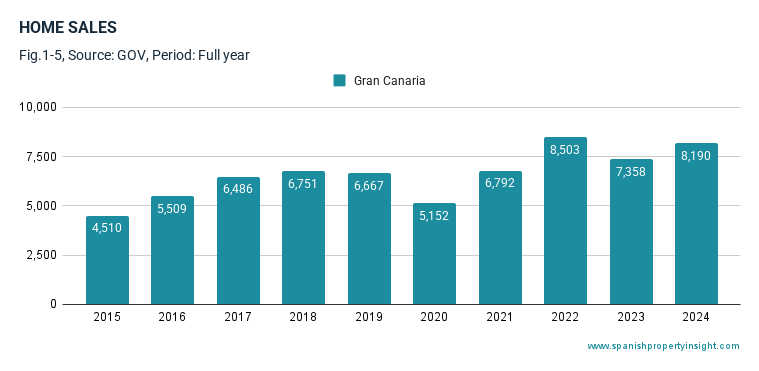 Within the island, Gran Canaria’s municipalities recorded 8,190 home sales, reflecting a strong year-on-year growth of 11% (Fig. 1-5). This segment significantly outperformed other areas, standing 24% higher than the ten-year average and 82% greater than the total sales recorded a decade earlier.