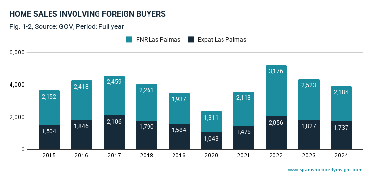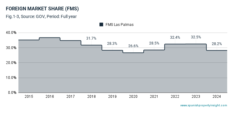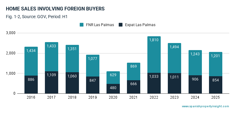 There were 7,260 home sales in Las Palmas province during the first half of 2025 (Fig. 1‑1), broadly in line with the ten-year average, and just 1.8% higher. Over the full ten-year period, sales have grown by 15.8%, confirming the long-term strength of demand in this province of the Canary Islands. However, the pace of foreign demand has slowed. There were 2,055 sales involving buyers from abroad in H1 2025, down 4.4% year-on-year (Fig. 1‑2), with the largest drop coming from expat buyers already resident in Spain (‑5.7%), compared to a smaller fall in foreign non-resident (FNR) buyers (‑3.4%). FNRs—typically second-home and investment buyers—accounted for 1,201 purchases, while expats made 854.