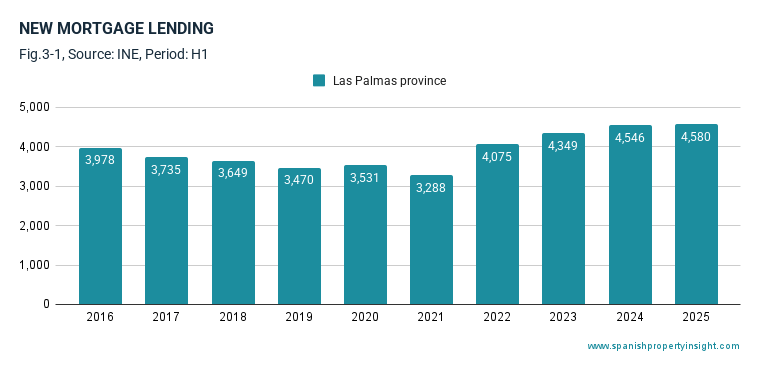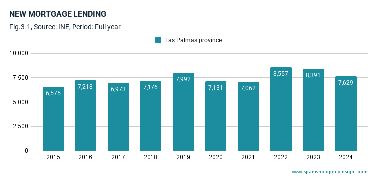 New mortgage activity declined moderately during 2024. Las Palmas province registered 7,629 new mortgages, down 9% on an annual basis (Fig. 3-1). Despite the recent dip, lending levels were still 2% above the ten-year average and 16% higher than in 2014.