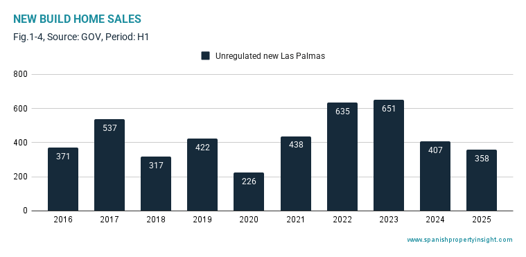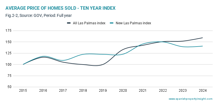 During the period, the average sale price for all residential properties in Las Palmas was €181,496, marking a 5% increase compared to the previous year (Fig. 2-1). In contrast, newly built homes recorded a slightly higher average price of €182,099, but with limited growth of just 1% year-on-year. This suggests a stabilisation in new-build pricing, possibly due to more balanced supply and demand in that segment.
