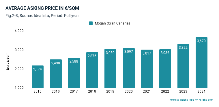 In the island’s popular coastal municipality of Mogán, average asking prices hit €3,670 per square metre in 2024, with a 10% year-on-year increase (Fig. 2-3). Over five years, asking prices have grown by 20%, consolidating Mogán’s position as a sought-after location.