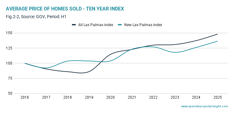 The average price of homes sold in Las Palmas during H1 2025 was €195,786 (Fig. 2‑1), up 7.9% year-on-year. New-build homes averaged €208,705, rising 8.3%. Over the last decade, general house prices in the province have increased by 48.2%, while new-build prices have risen 36.6% (Fig. 2‑2). This suggests that resale homes have gained relatively more in value, possibly due to tight supply and growing demand in established locations.