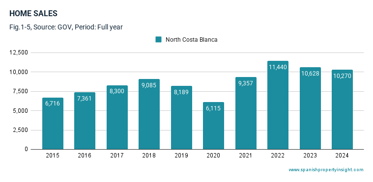 In the municipalities of the North Costa Blanca, there were 5,464 home sales, reflecting a year-on-year decline of 2% (Fig. 1-5). However, compared to the ten-year average, this represents an increase of 26%, and over the decade, sales have grown by 62%.